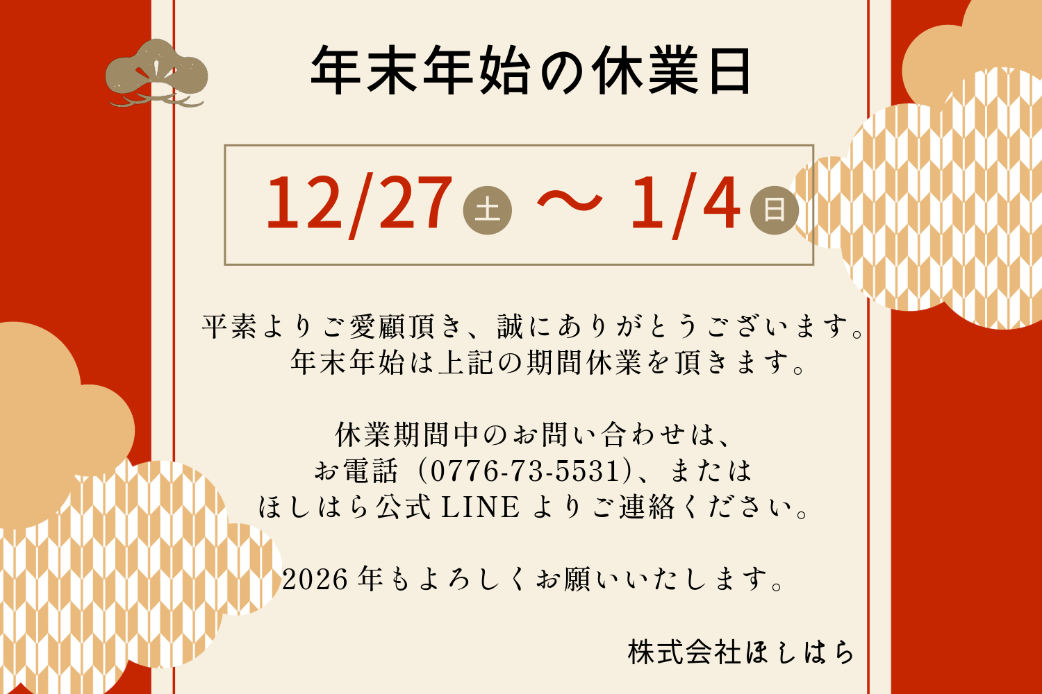 年末年始休業についておしらせ 2025年12月24日 お知らせ 年末年始休業日についてお知らせいたします。 ■年末年始休業期間 2025年12月27日(土)〜2026年1月4日(日) 休業期間中のお問い合わせは、お電話(0776-73-5531)、またはほしはら公式LINEよりご連絡ください。 ほしはら公式LINEは下記のQRコードよりともだち登録をお願いします。 来年もよろしくお願いいたします。